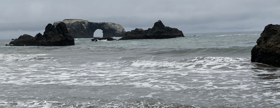 We also walked along the coast in the Goat Rock State Park with crashing surf. When I waded in to rinse the sand out of my sandals, a huge breaker came in and nearly engulfed me. I didn’t get pulled under, thankfully, because I had my phone in my pocket, but my son caught this photo.